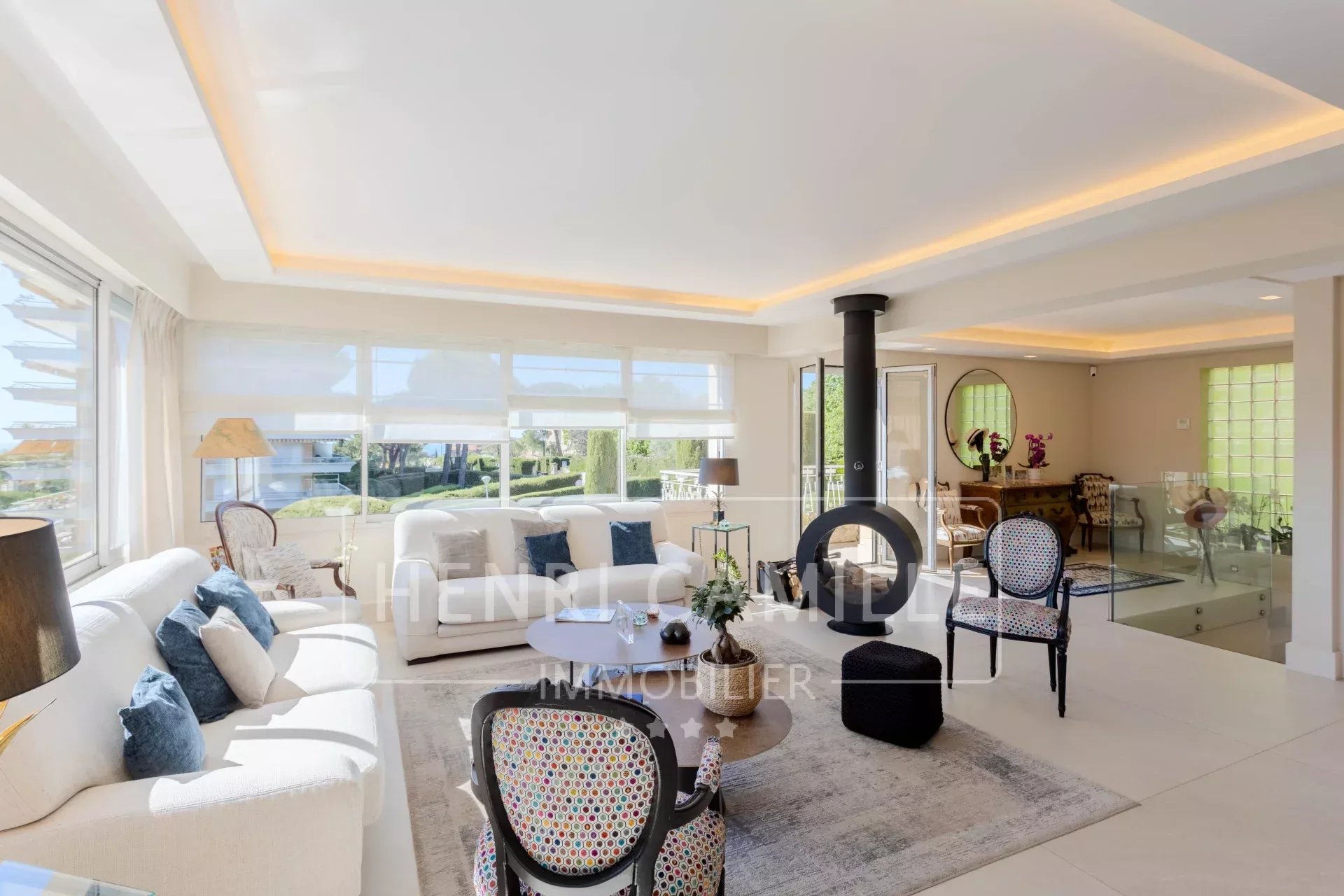 Very bright, the apartment has been completely renovated with high-end materials (custom-made furniture and wardrobes, rotating wood stove, built-in air conditioning…).